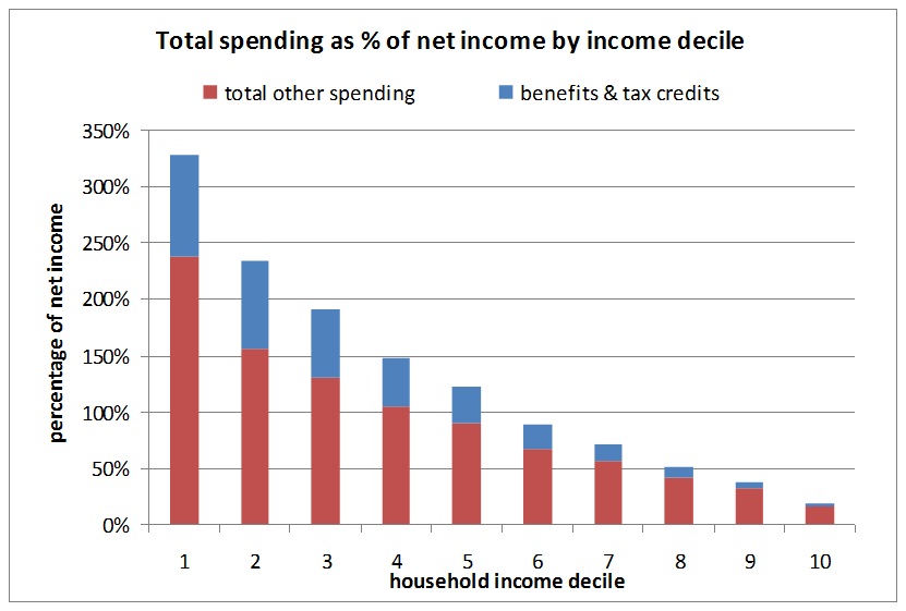 Figure 1: The distribution of public spending by income. Note: Average annual spending per household, as a proportion of net household income, by household income decile (2007–08).